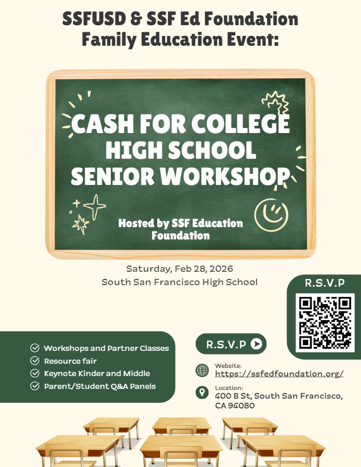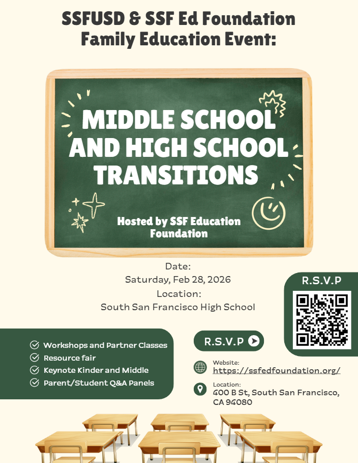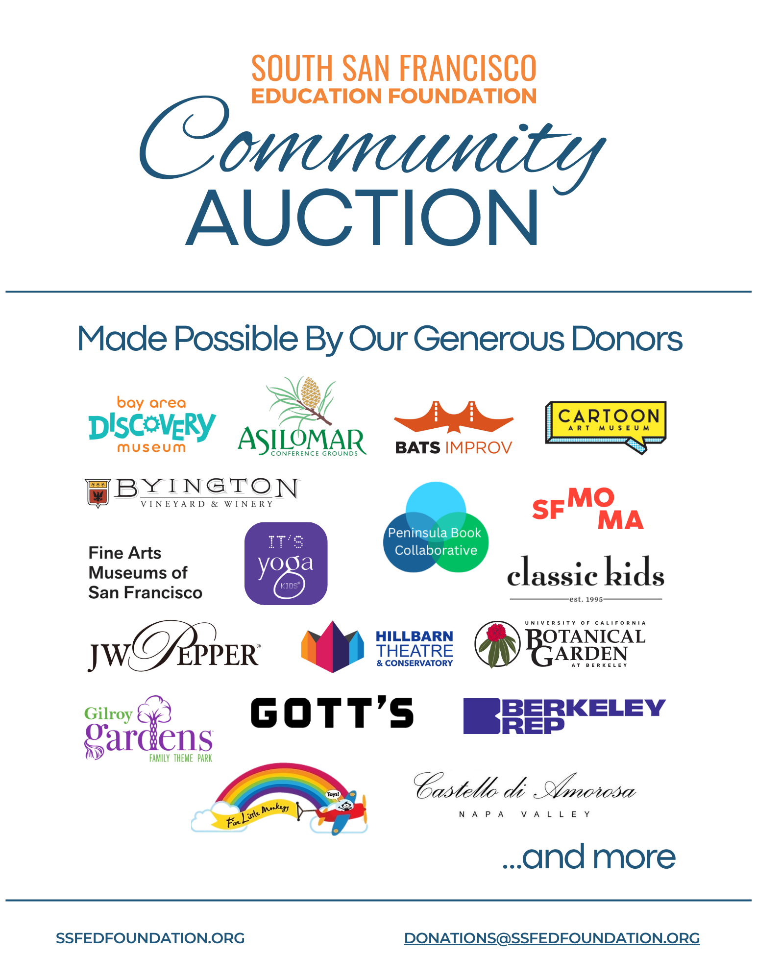 Join us for our first-ever Community Auction, featuring both an online auction and a live, in-person event that bring together local businesses, partners, and supporters to benefit our students. Bid on exciting items and experiences online or join us in person for a live auction experience, all while helping fund programs and initiatives that support student success across South San Francisco.